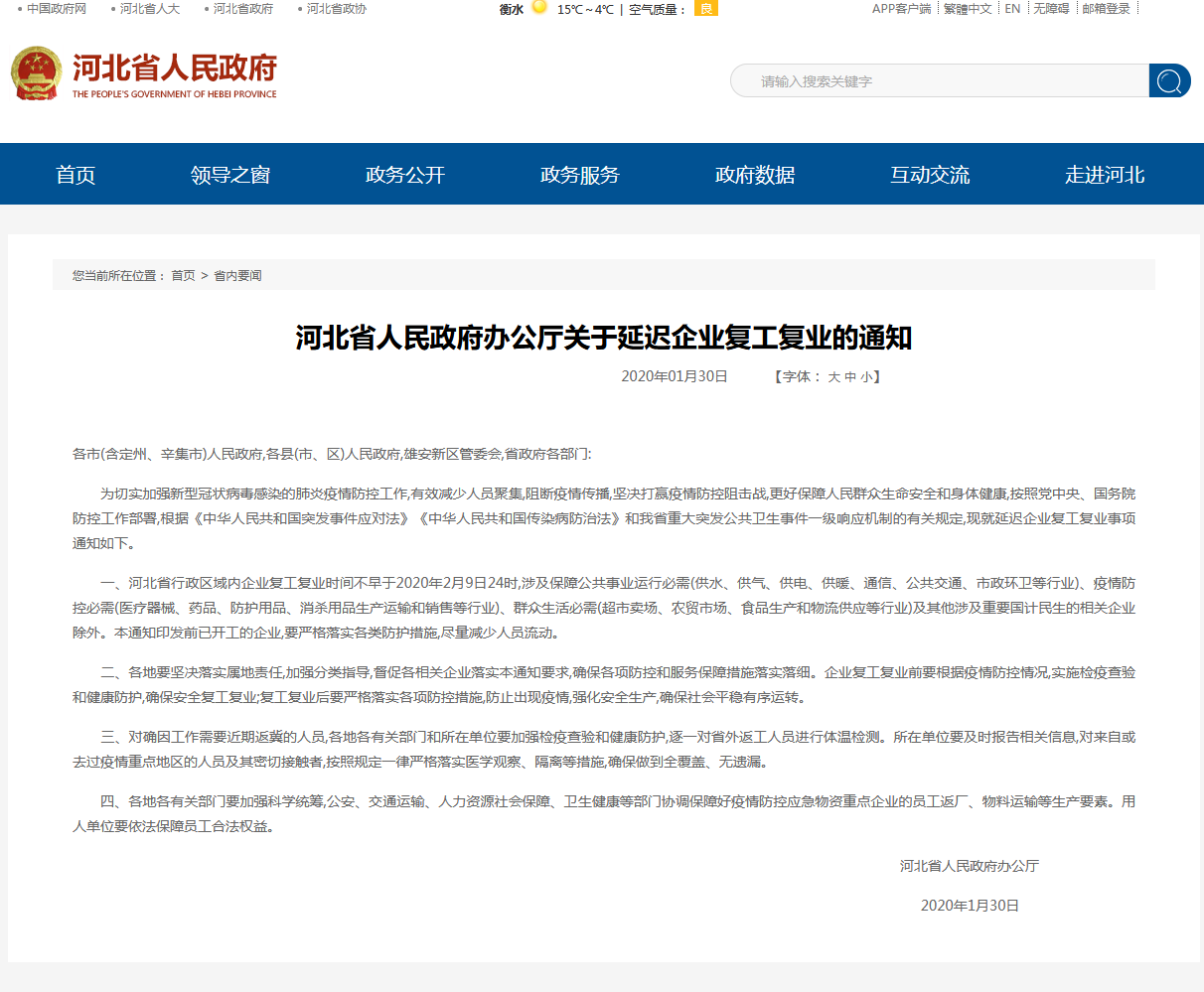 為切實加強新型冠狀病毒感染的肺炎疫情防控工作,有效減少人員聚集,阻斷疫情傳播,堅決打贏疫情防控阻擊戰(zhàn),更好保障人民群眾生命安全和身體健康,按照《河北省人民政府辦公廳關(guān)于延遲企業(yè)復(fù)工復(fù)業(yè)的通知》精神,現(xiàn)就延遲企業(yè)復(fù)工復(fù)業(yè)事項通知如下。